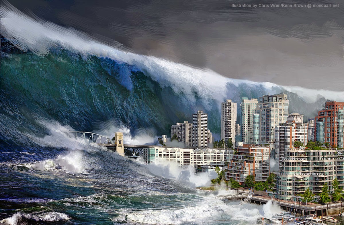 No, they don't live happily ever after. Do you know what a tsunami is? A tsunami is a giant wave. Sharks live in the sea. Sometimes sharks eat people...and dogs! Maybe living at the beach isn't a good idea. Is it a good idea to live near the beach?